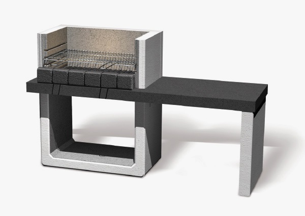 Lightweight concrete barbecue with wide side table. Reinforced worktop. Fireplace with grille chrome-plated cooking grill, adjustable to 3 heights. Worktop and Safe Grill are pre-coloured in the compound. Available colours: Grey cement and Licorice.