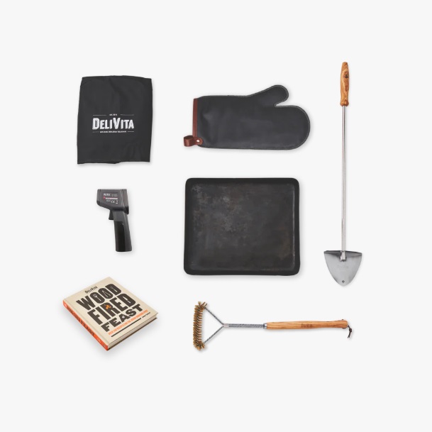 The DeliVita Chef Package includes: All-Weather Cover; Black Iron Dish; Leather Glove; Oven Brush; Prod & Blow; Infrared Gun; Wood-Fired Feast Book.