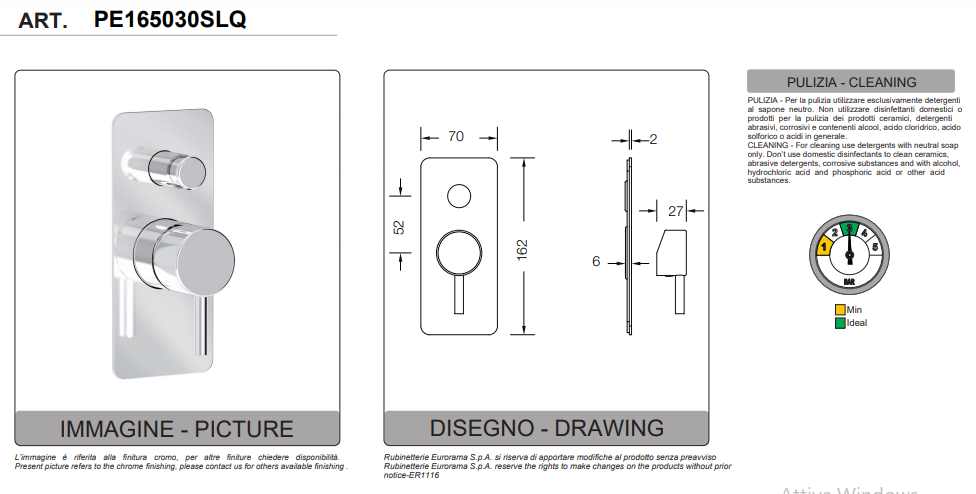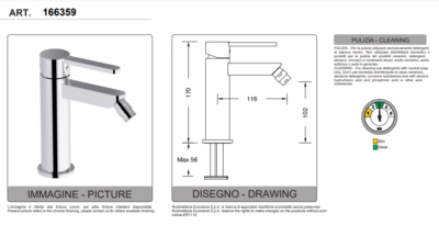 CURA E MANUTENZIONE: La ricerca dei migliori materiali costituisce un punto di riferimento del sistema qualità Eurorama. Ogni singolo componente della rubinetteria è realizzato per durare nel tempo in condizioni ottimali e anche dopo un intenso utilizzo, nonostante ciò anche le superfici più resistenti hanno necessità di cura e manutenzione per mantenere intatte le loro caratteristiche estetiche. L’acqua contiene calcare in rapporto al grado di durezza della zona di captazione, nel caso di mancanza di cura ed in seguito all’evaporazione dell’acqua sul prodotto, può manifestarsi lo sgradevole inconveniente dell’antiestetico deposito bianco. L’azione preventiva è fondamentale, per prevenire le formazioni di depositi di calcare e mantenere i prodotti puliti, è necessario perciò ricordarsi di asciugare la rubinetteria con un panno morbido (microfibra) immediatamente dopo l’uso. Sciacquare sempre i prodotti dopo la loro pulizia, con abbandonate acqua corrente, ed asciugare con un panno morbido.