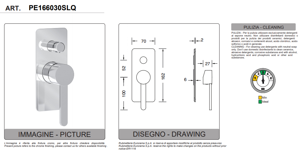 CURA E MANUTENZIONE: La ricerca dei migliori materiali costituisce un punto di riferimento del sistema qualità Eurorama. Ogni singolo componente della rubinetteria è realizzato per durare nel tempo in condizioni ottimali e anche dopo un intenso utilizzo, nonostante ciò anche le superfici più resistenti hanno necessità di cura e manutenzione per mantenere intatte le loro caratteristiche estetiche. L’acqua contiene calcare in rapporto al grado di durezza della zona di captazione, nel caso di mancanza di cura ed in seguito all’evaporazione dell’acqua sul prodotto, può manifestarsi lo sgradevole inconveniente dell’antiestetico deposito bianco. L’azione preventiva è fondamentale, per prevenire le formazioni di depositi di calcare e mantenere i prodotti puliti, è necessario perciò ricordarsi di asciugare la rubinetteria con un panno morbido (microfibra) immediatamente dopo l’uso. Sciacquare sempre i prodotti dopo la loro pulizia, con abbandonate acqua corrente, ed asciugare con un panno morbido.