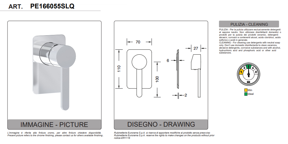 CURA E MANUTENZIONE: La ricerca dei migliori materiali costituisce un punto di riferimento del sistema qualità Eurorama. Ogni singolo componente della rubinetteria è realizzato per durare nel tempo in condizioni ottimali e anche dopo un intenso utilizzo, nonostante ciò anche le superfici più resistenti hanno necessità di cura e manutenzione per mantenere intatte le loro caratteristiche estetiche. L’acqua contiene calcare in rapporto al grado di durezza della zona di  captazione, nel caso di mancanza di cura ed in seguito all’evaporazione dell’acqua sul prodotto, può manifestarsi lo sgradevole inconveniente dell’antiestetico deposito bianco. L’azione preventiva è fondamentale, per prevenire le formazioni di depositi di calcare e mantenere i prodotti puliti, è necessario perciò ricordarsi di asciugare la rubinetteria con un panno morbido (microfibra) immediatamente dopo l’uso. Sciacquare sempre i prodotti dopo la loro pulizia, con abbandonate acqua corrente, ed asciugare con un panno morbido.