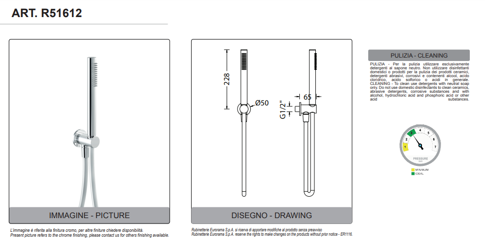 Il kit doccia cilindrico Eurorama è composto da un supporto cilindrico in metallo con presa acqua 1/2″, un flessibile da 1,50 m e una doccetta cilidrica monogetto. Le finiture disponibili sono: Cromo, Nero Opaco, Bianco Opaco, Nickel Satinato, Rame Spazzolato, Nickel Nero Satinato, Bronzo Spazzolato, Oro Satinato, Rame Satinato Opaco, Bronzo Satinato Opaco, Oro Lucido.