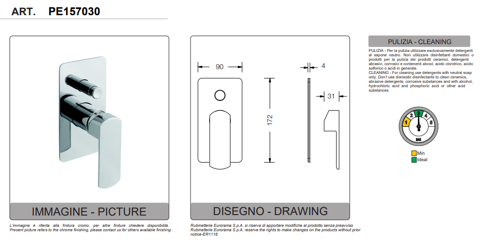 CURA E MANUTENZIONE: La ricerca dei migliori materiali costituisce un punto di riferimento del sistema qualità Eurorama. Ogni singolo componente della rubinetteria è realizzato per durare nel tempo in condizioni ottimali e anche dopo un intenso utilizzo, nonostante ciò anche le superfici più resistenti hanno necessità di cura e manutenzione per mantenere intatte le loro caratteristiche estetiche. L’acqua contiene calcare in rapporto al grado di durezza della zona di captazione, nel caso di mancanza di cura ed in seguito all’evaporazione dell’acqua sul prodotto, può manifestarsi lo sgradevole inconveniente dell’antiestetico deposito bianco. L’azione preventiva è fondamentale, per prevenire le formazioni di depositi di calcare e mantenere i prodotti puliti, è necessario perciò ricordarsi di asciugare la rubinetteria con un panno morbido (microfibra) immediatamente dopo l’uso. Sciacquare sempre i prodotti dopo la loro pulizia, con abbandonate acqua corrente, ed asciugare con un panno morbido.
