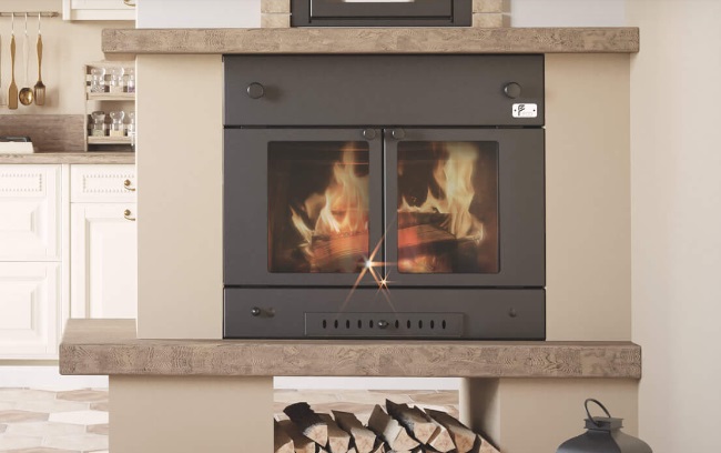 The Fuego fireplace stove can power radiators throughout the home and produces hot water for domestic use. It can be connected to the heating system, even an existing one, and has a series of technical and aesthetic features specially designed to ensure great functionality in all phases of use. The Fuego fireplace stove, thanks to a large mixed copper-steel tube bundle (patented system), gives a yield of over 90%.